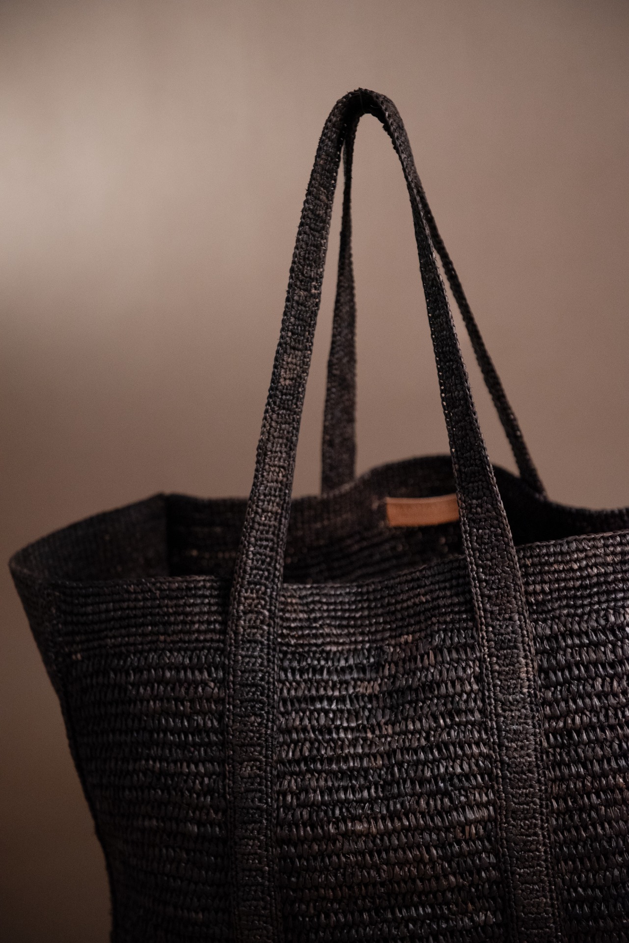 Tmavě šedý odstín vzniká ručním barvením rafie přírodní zeminou, což vytváří jemné nepravidelnosti v barvě a dává každé kabelce její jedinečný charakter. Unikátní kombinace různých druhů stehů háčkování dodává texturu, kontrast a jemnou eleganci
